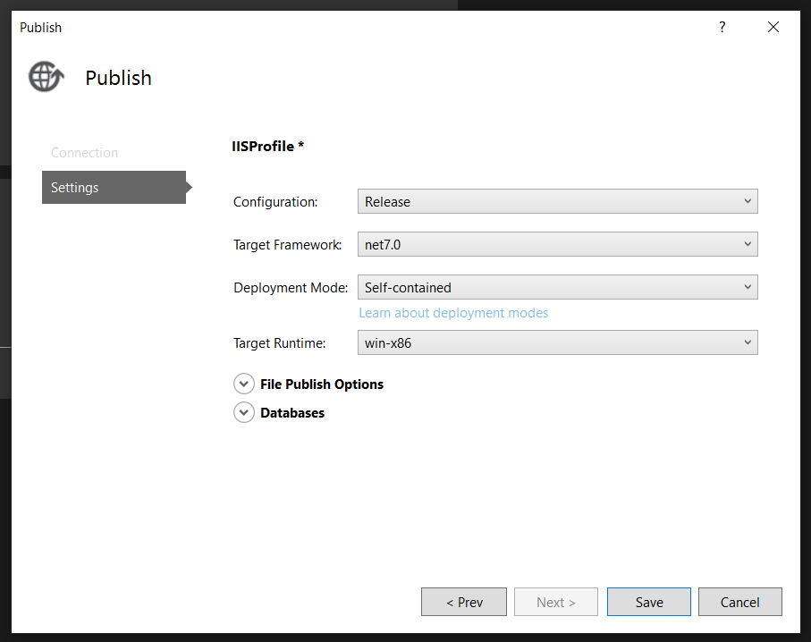 On the "Settings" page, you need to change "Deployment Mode" to Self-contained