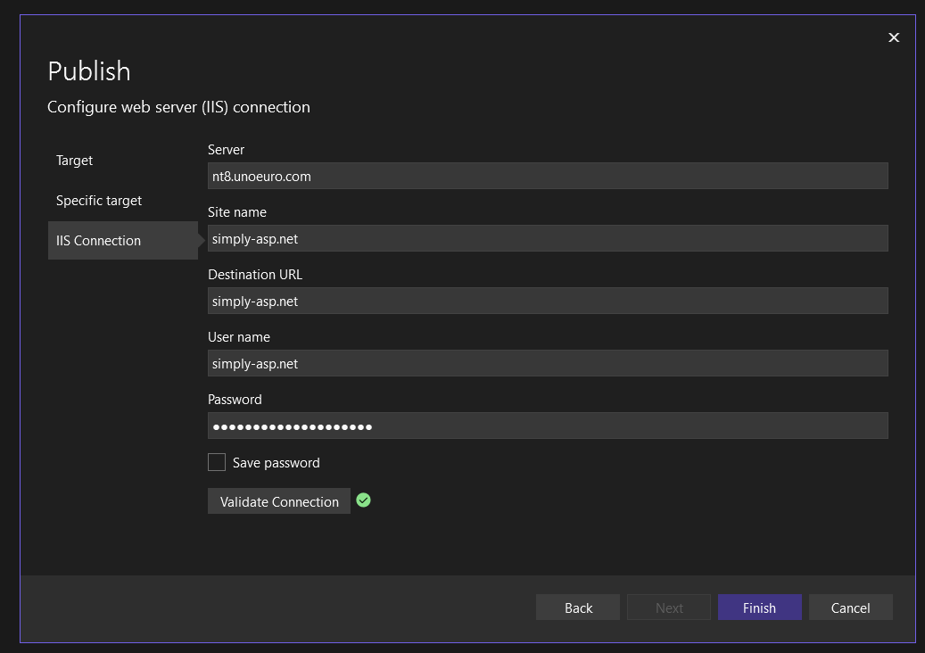 When the connection is validated with a green check mark, you can click Finish to continue.