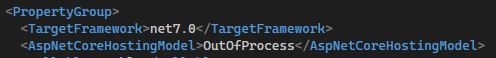 <AspNetCoreHostingModel>OutOfProcess</AspNetCoreHostingModel> beneath the "TargetFramework" line.