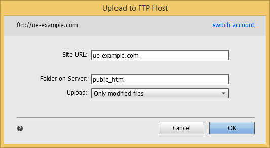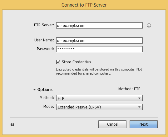 The following screen will appear in which you need to fill in your FTP information as they appear in your creation email.