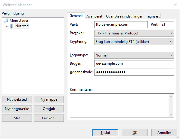 Fill in the "Host", "User" and "Password" fields as indicated in the "FTP Information" section of your creation email (replace ue-example.com with your own domain). During encryption, we recommend choosing "Use only regular FTP". Select "Normal" as "Logo Type".