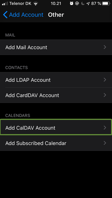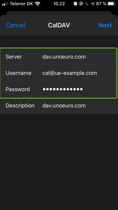 5. Enter dav.simply.com as the server, enter your mail address as your username, fill out the password and tap Next.
