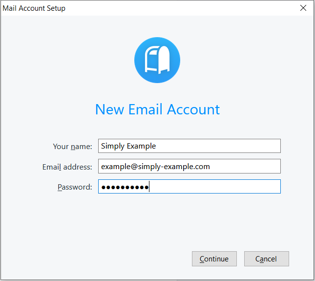 1. Open Postbox and fill out name, your mail address and the password you made for the mail. Click on "Next".