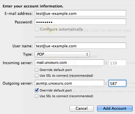Fill out the columns with the information that matches with the mail account you would like to receive and send mails through. As an example, "test@ue-example.com" would be changed out with jens@jensjensen.dk", and your incoming server gets replaced with our server.