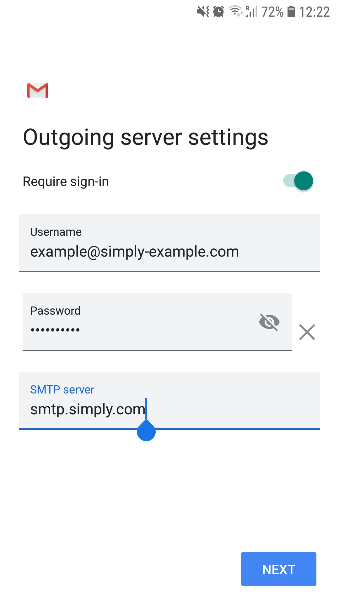 8. Correct the text in the "SMTP server"-column to smtp.simply.com.