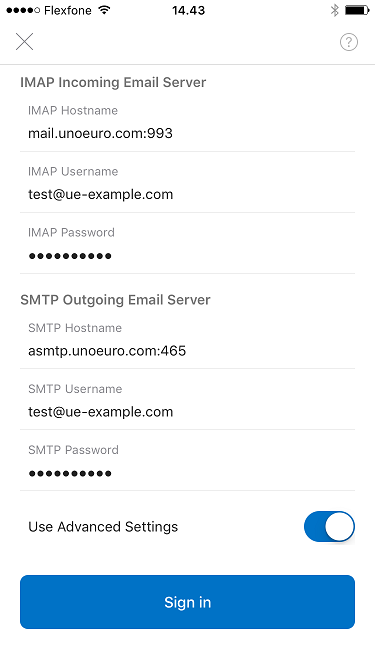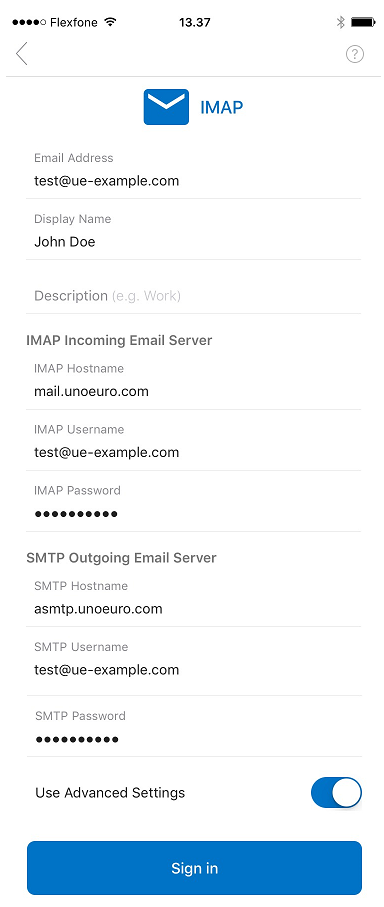 3. Make sure that "Use Advanced Settings" is activated and specify the settings as shown below. The only thing that you must change is the username which should be your own mail account, and the password you used to create the mail-account through our Dashboard.