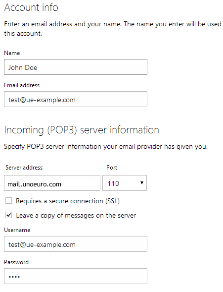 4. Specify your name, mail account and fill out the server settings as shown for the incoming server. You have to replace our example with your own server settings. The correct settings are seen in the product mail we sent to you upon registering your product. The "Username" must be your mail account and as the password you should use the one that you used to create the mail through Mail Administration in our Dashboard.