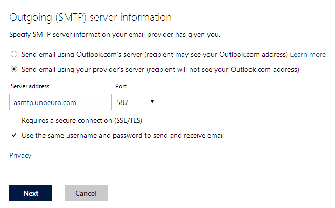 5. Fill in the shown settings for the outgoing server and press "Next".