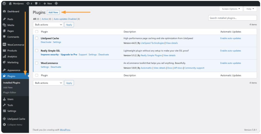 Navigate to the Plugins section in your dashboard and click Add New.