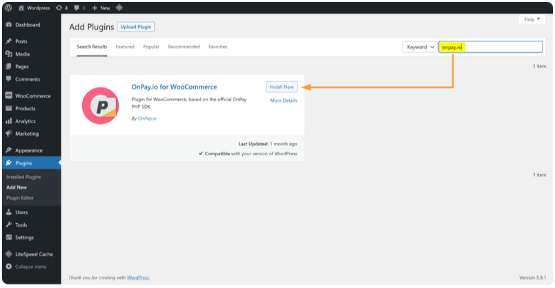Search for onpay.io, then click Install Now.