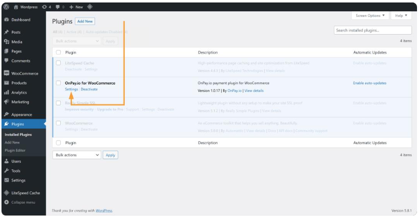Once installed, locate OnPay in your list of installed plugins and click Settings.