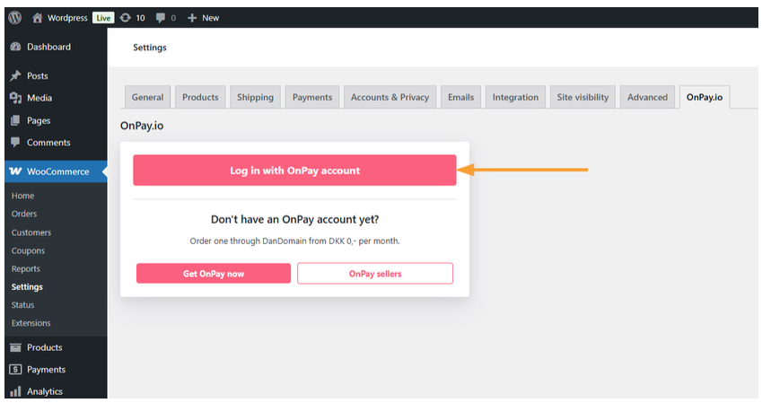 Within the OnPay settings, click Log in with OnPay to connect your WooCommerce store to your OnPay account.